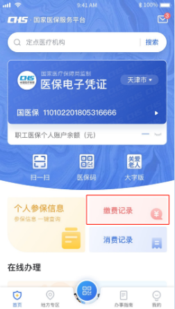 参保人登录激活医保电子凭证后,在“国家医保服务平台”APP首页点击【缴费记录】。