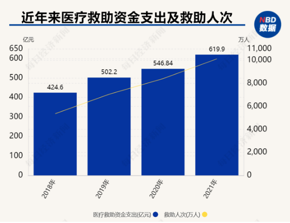 2021年,全国医疗救助支出619.90亿元,实施门诊和住院救助超1亿人次