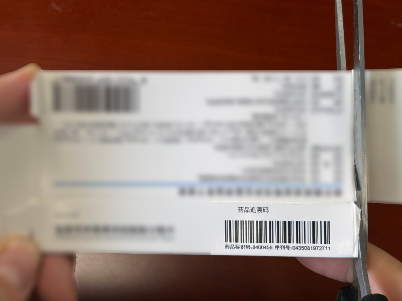 第二步,药吃完后,把药盒上带有追溯码的部分连同药盒正面剪下来留存,避免保存整个药盒过于占地方。