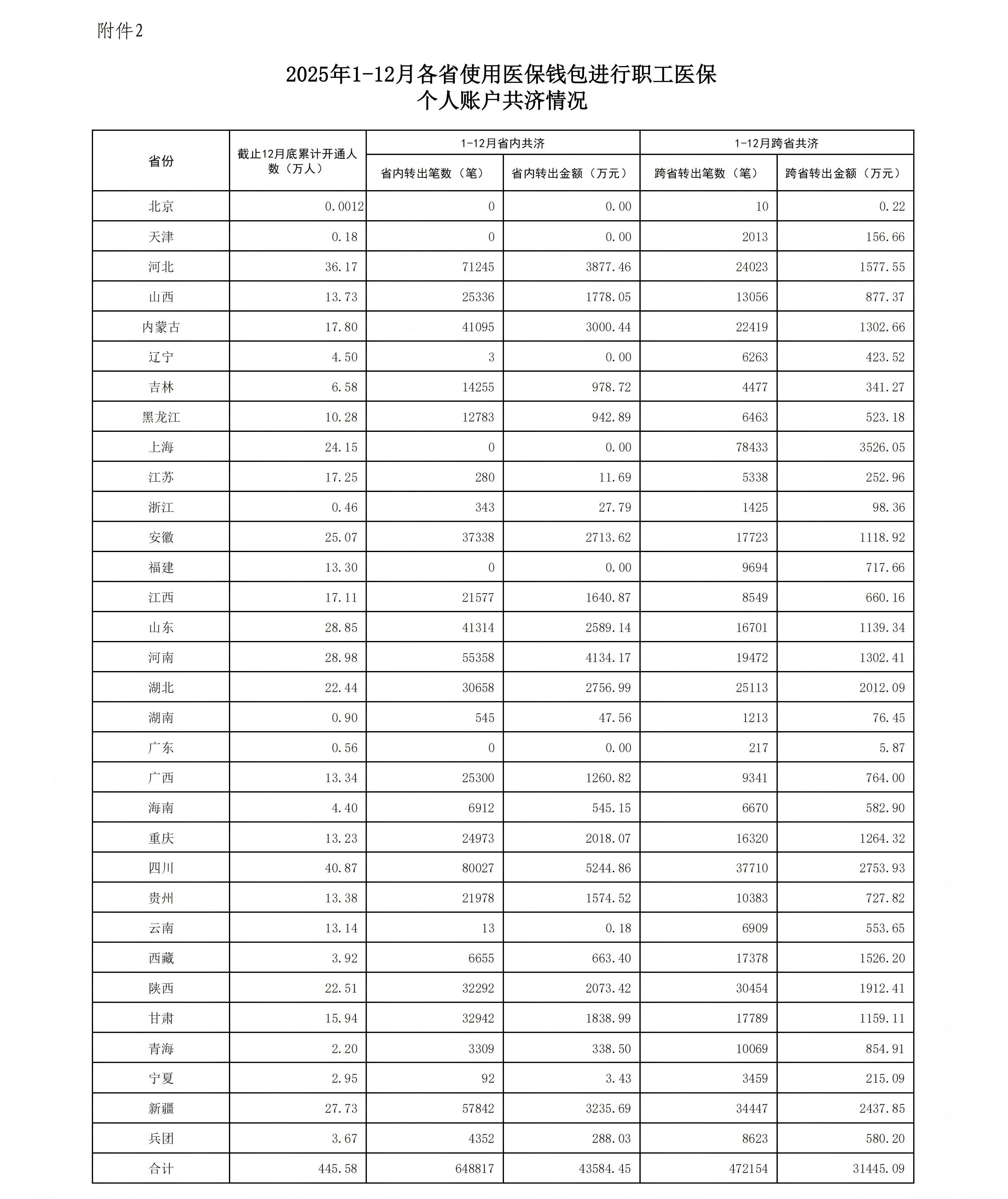 目前,职工医保个人账户共济可以通过即时调用被绑定人个人账户、医保钱包等方式实现。2025年1-12月职工医保个人账户共济人次4.64亿,金额687.7亿元。