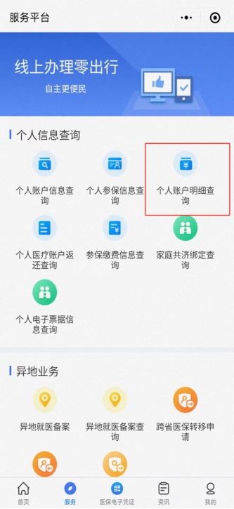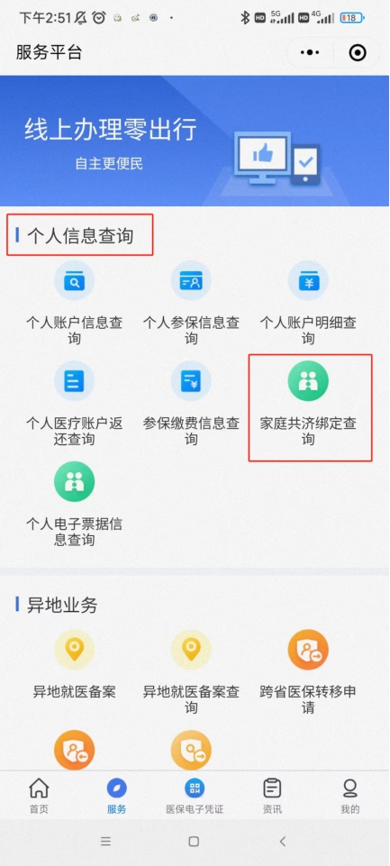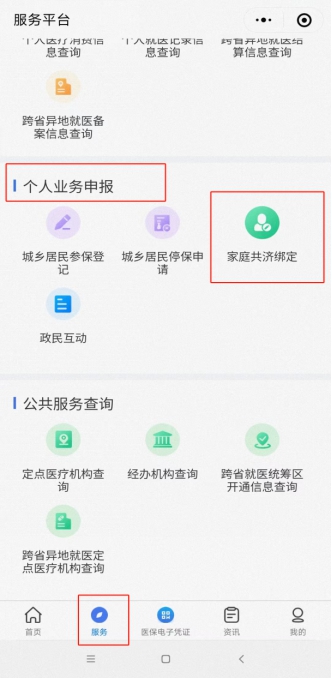 (1)点击左下角【服务】——【个人业务查询】——【家庭共济绑定查询】。