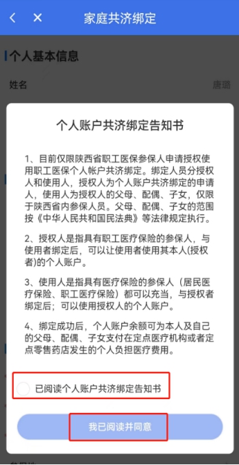 (1)登录成功进入页面后,点击左下角【服务】——【个人业务申报】——【家庭共济绑定】。进入页面,仔细阅读《个人账户共济绑定告知书》,阅读完成后勾选【已阅读个人账户共济绑定告知书】并点击【我已阅读并同意】。