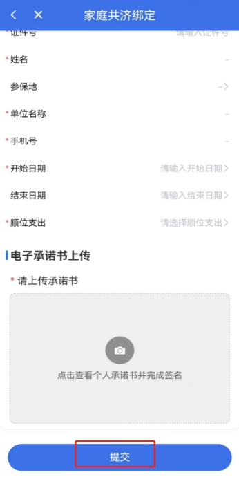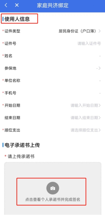 (2)进入家庭共济绑定信息填写页面,根据提示填写“使用人”的个人信息,确认无误后,点击【查看个人承诺书并完成签名】,完成签名后,点击【提交】,即可完成个人账户家庭共济绑定。
