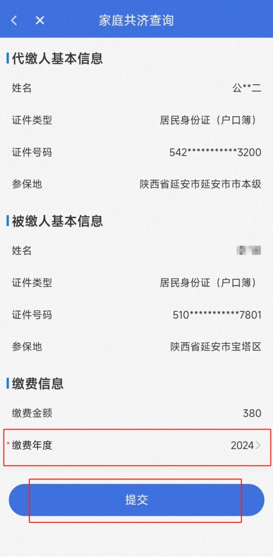 (3)【选择“缴费年度”】——【提交】(注意:刚参保成功的城乡居民参保人请在两个小时之后再进行代缴)。缴费提示“成功”后,表示个人账户代缴成功