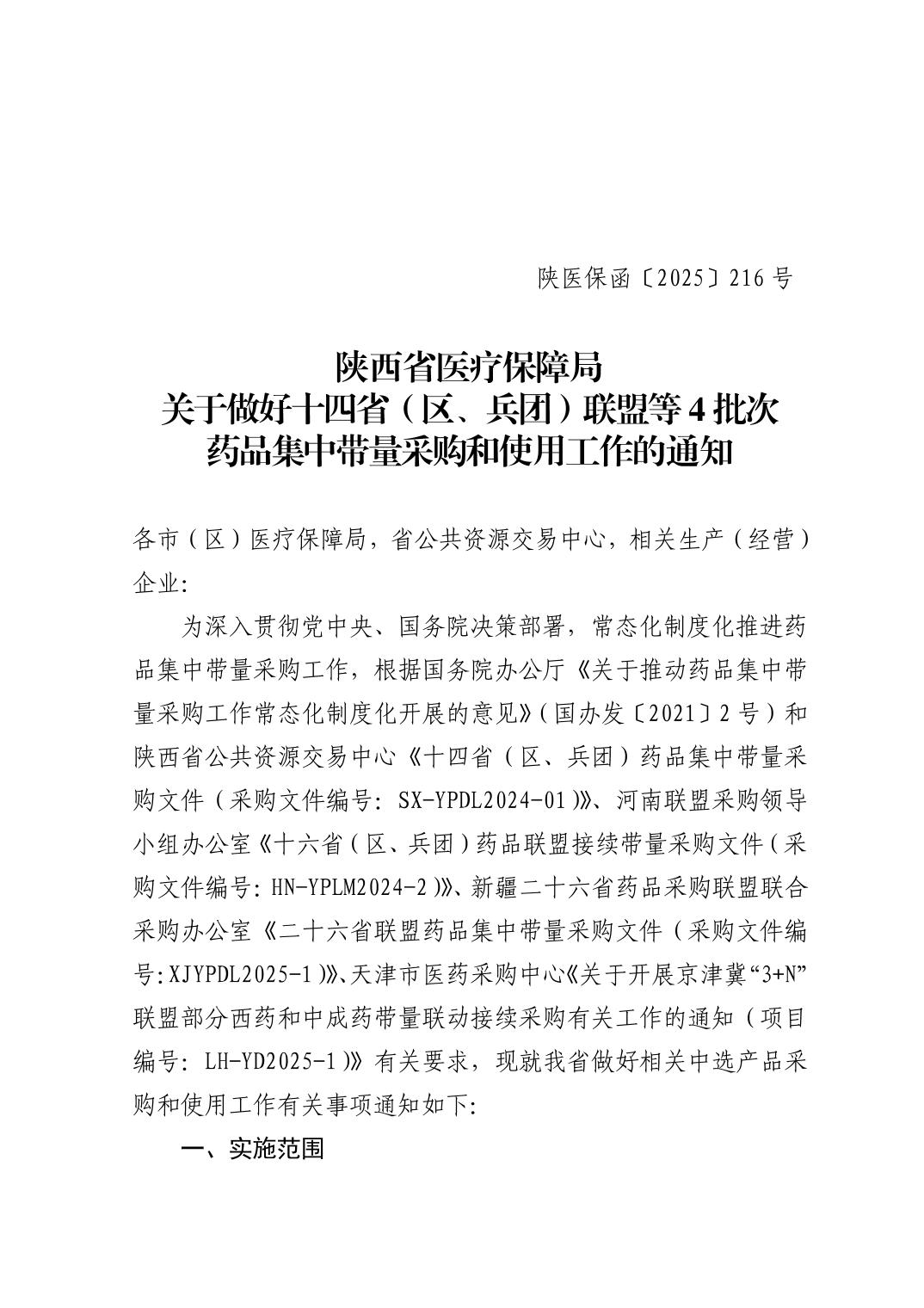陕西省医疗保障局关于做好十四省(区、兵团)联盟等 4 批次药品集中带量采购和使用工作的通知
