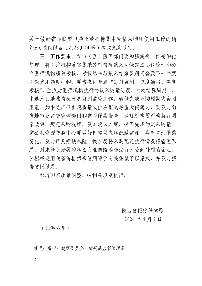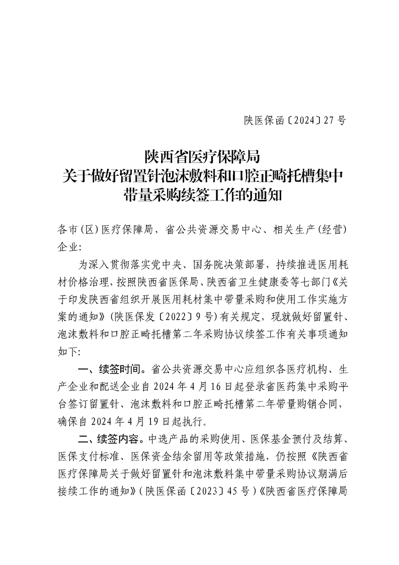 陕西省医疗保障局关于做好留置针泡沫敷料和口腔正畸托槽集中带量采购续签工作的通知