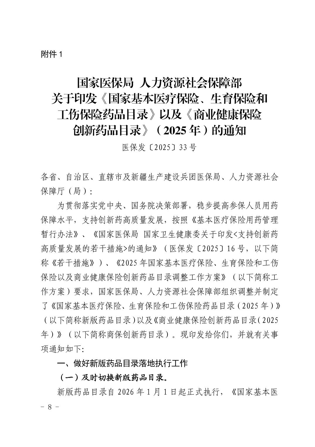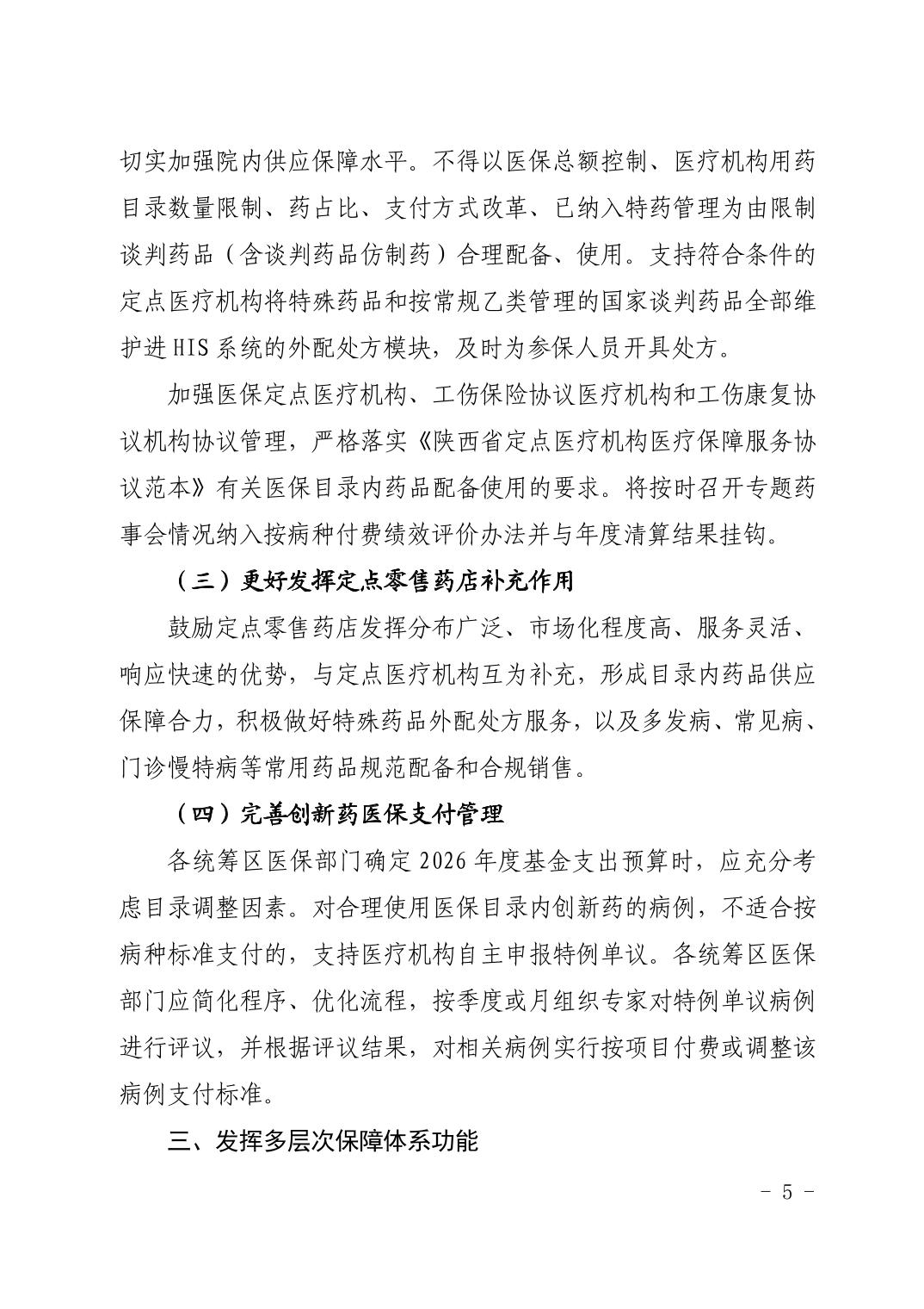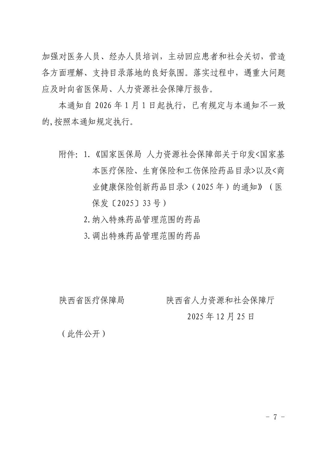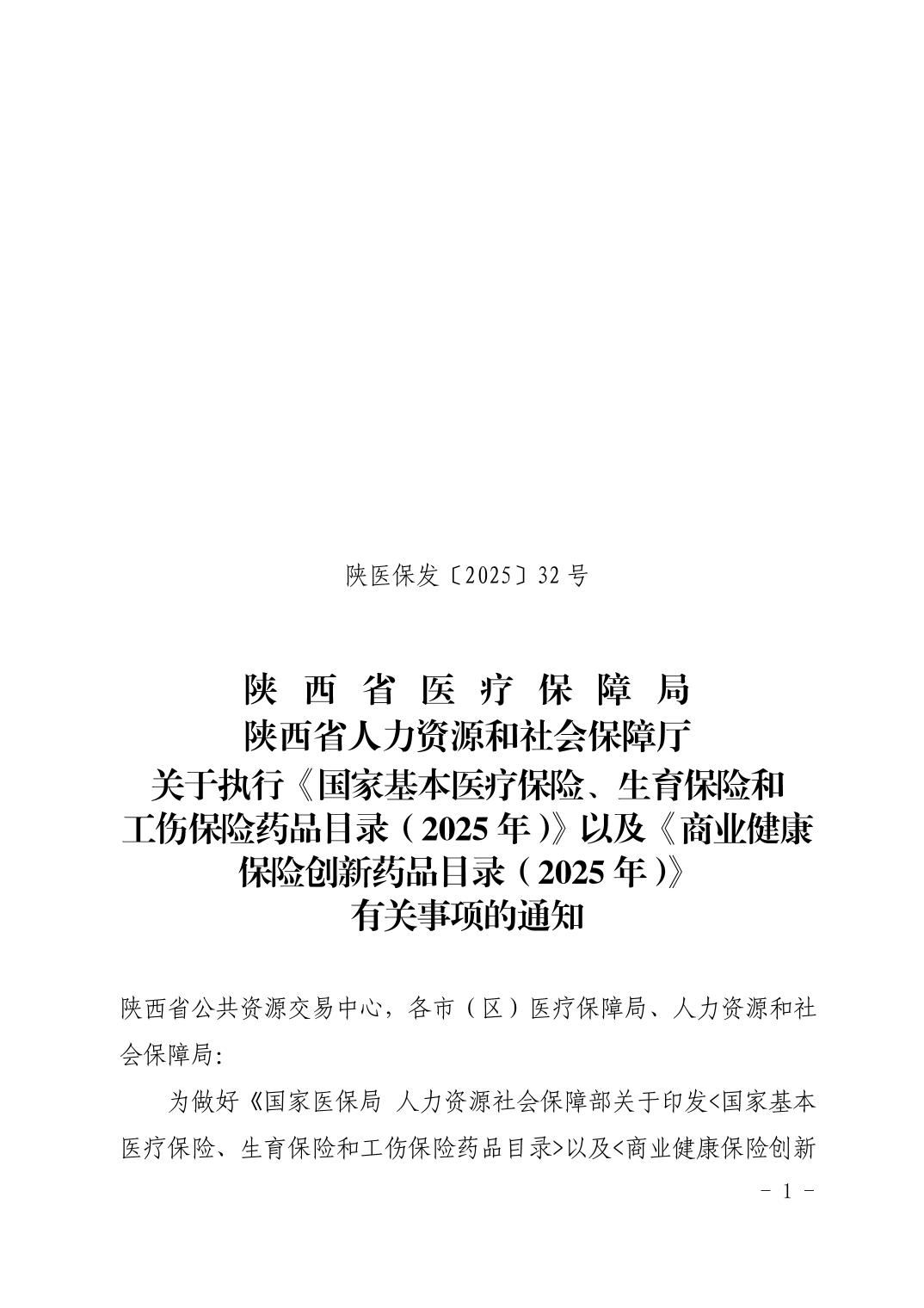陕西省医疗保障局 陕西省人力资源和社会保障厅 关于执行《国家基本医疗保险、生育保险和工伤保险药品目录(2025 年)》以及《商业健康保险创新药品目录(2025 年)》有关事项的通知
