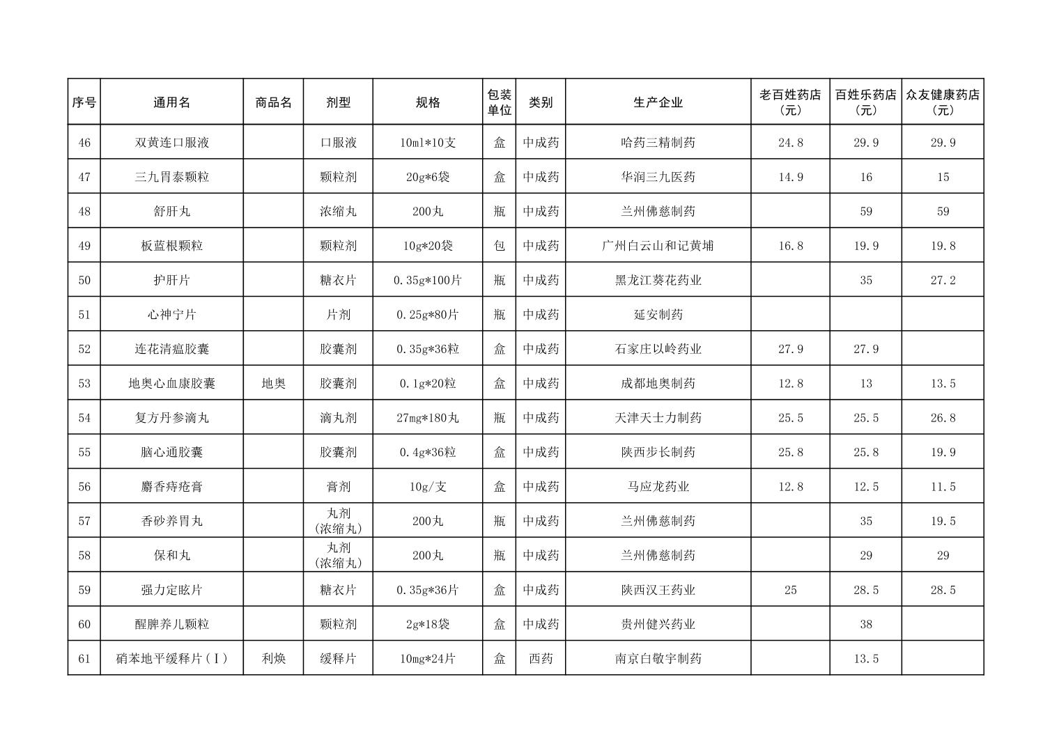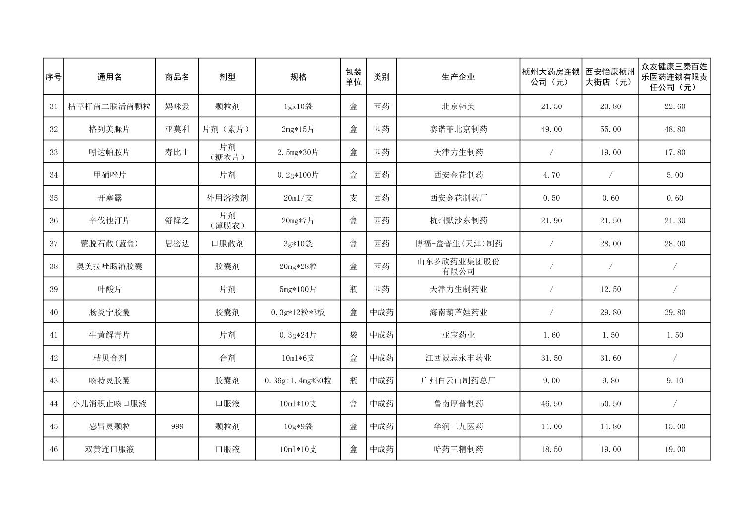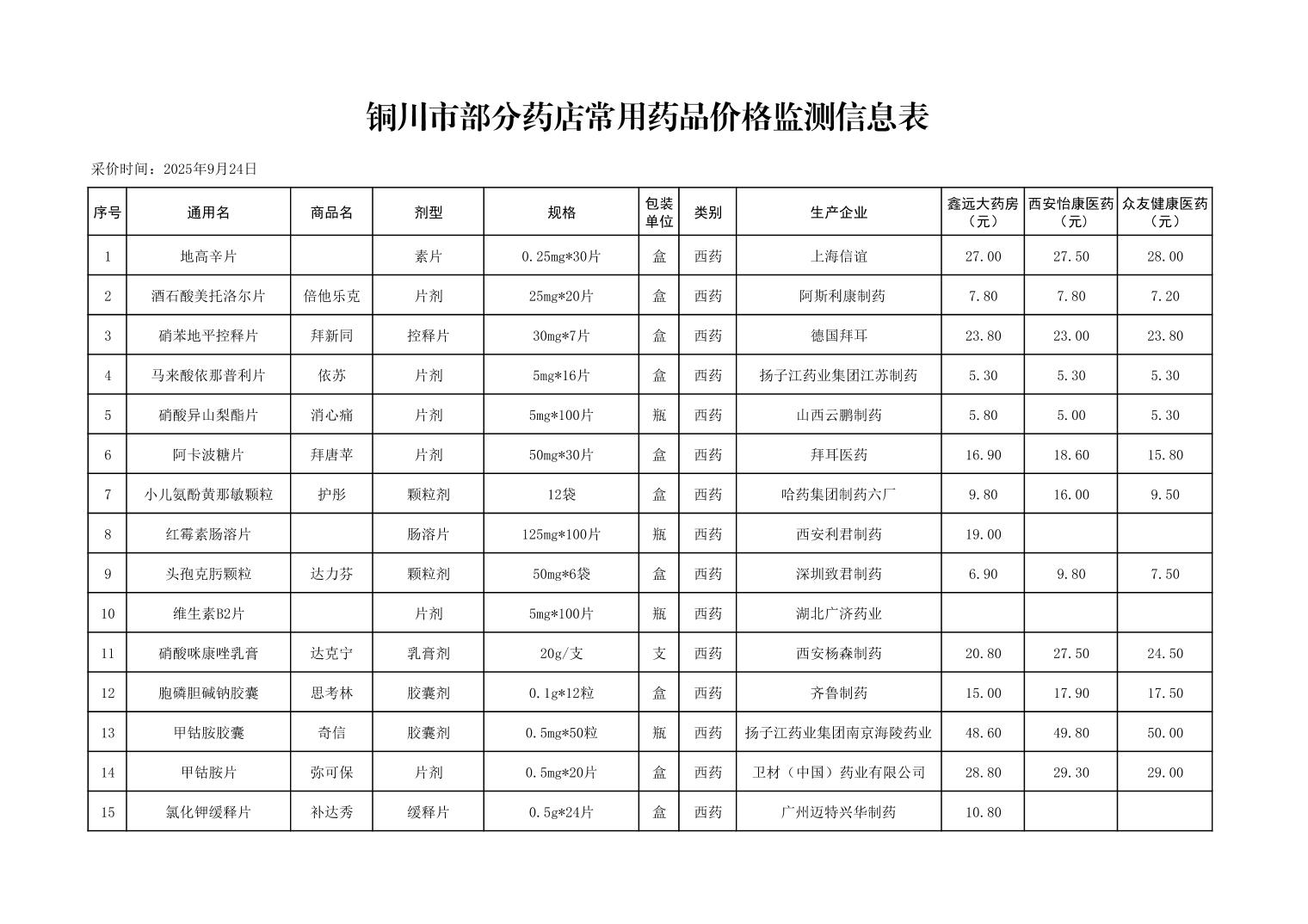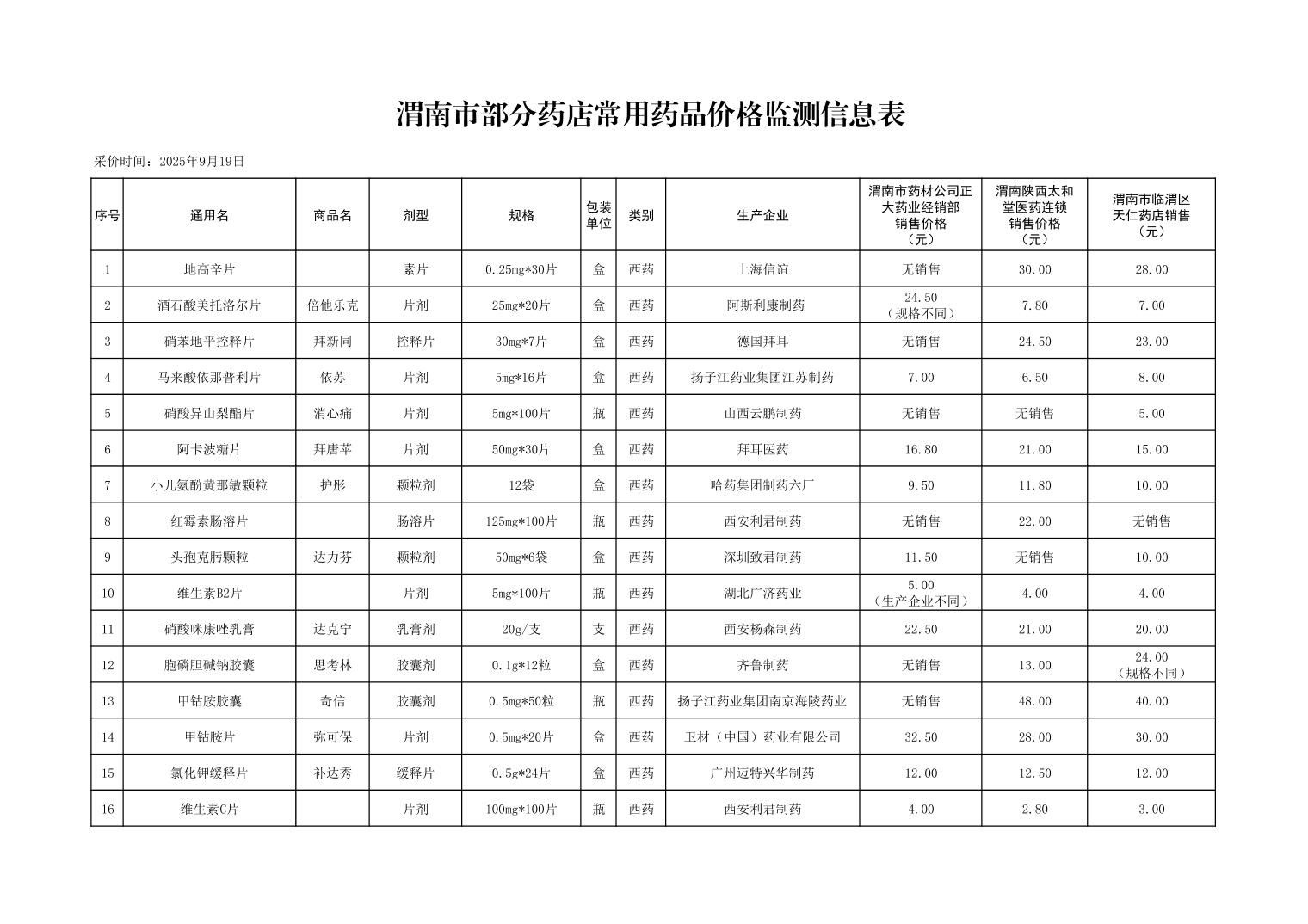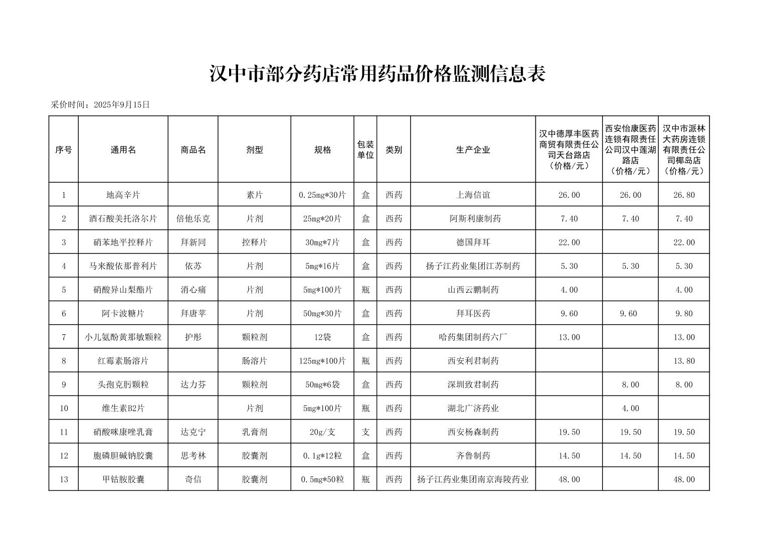 各市(区)部分定点药店常用药品零售价格监测情况 (2025年第9期)