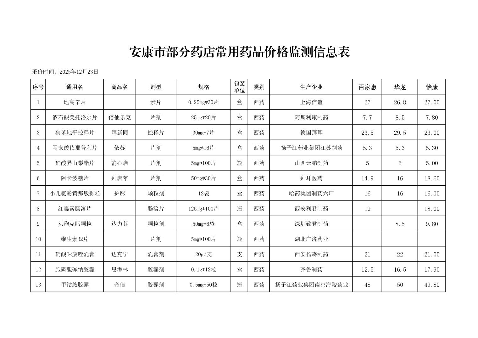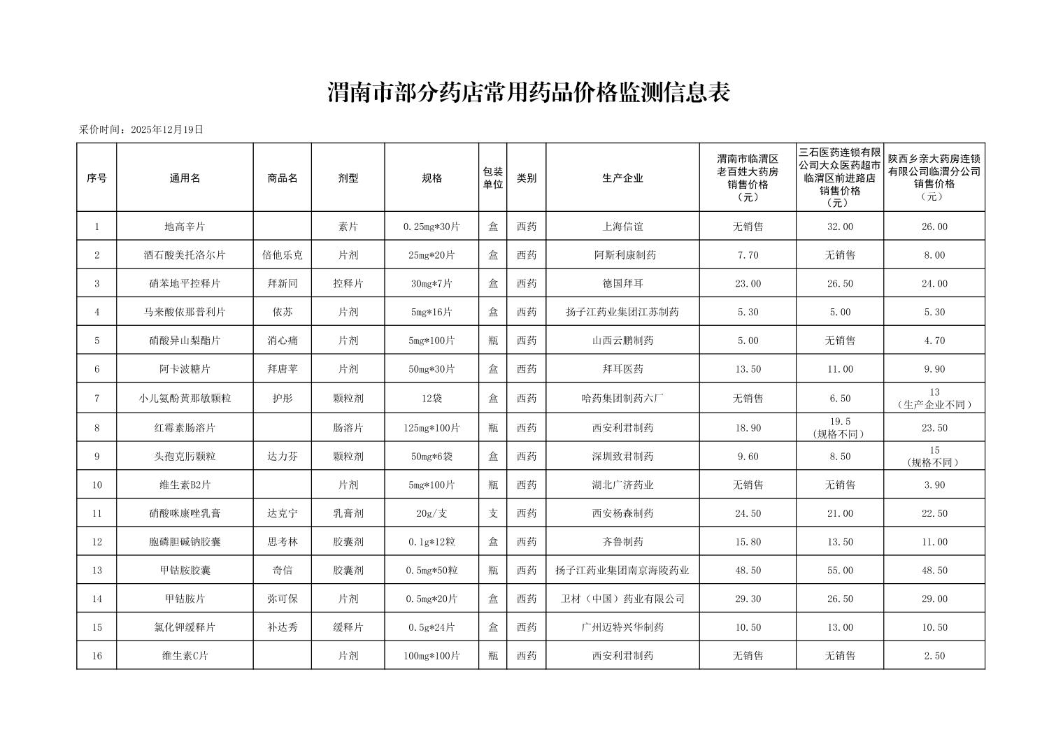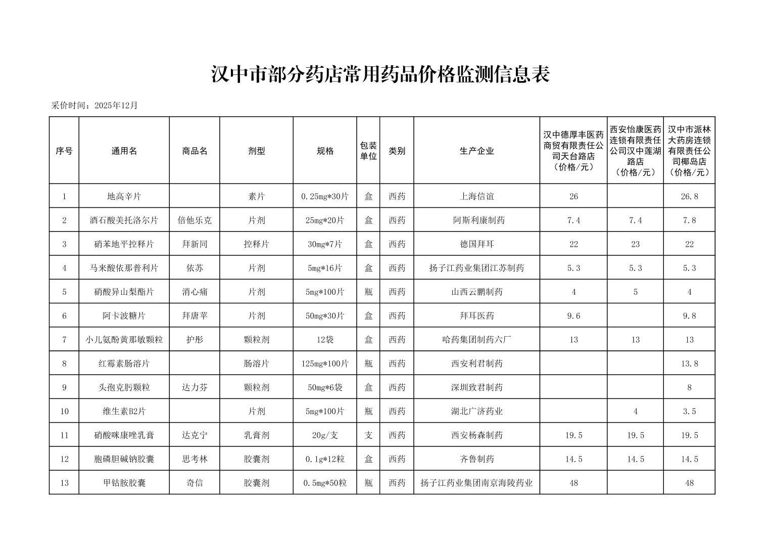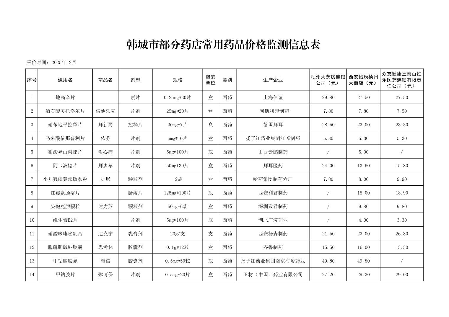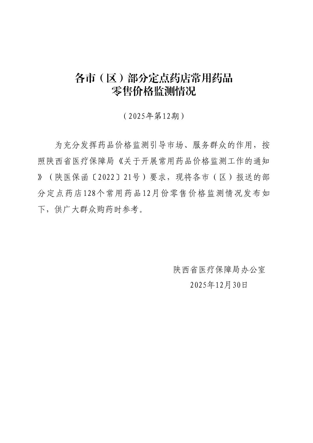 各市(区)部分定点药店常用药品零售价格监测情况 (2025年第12期)